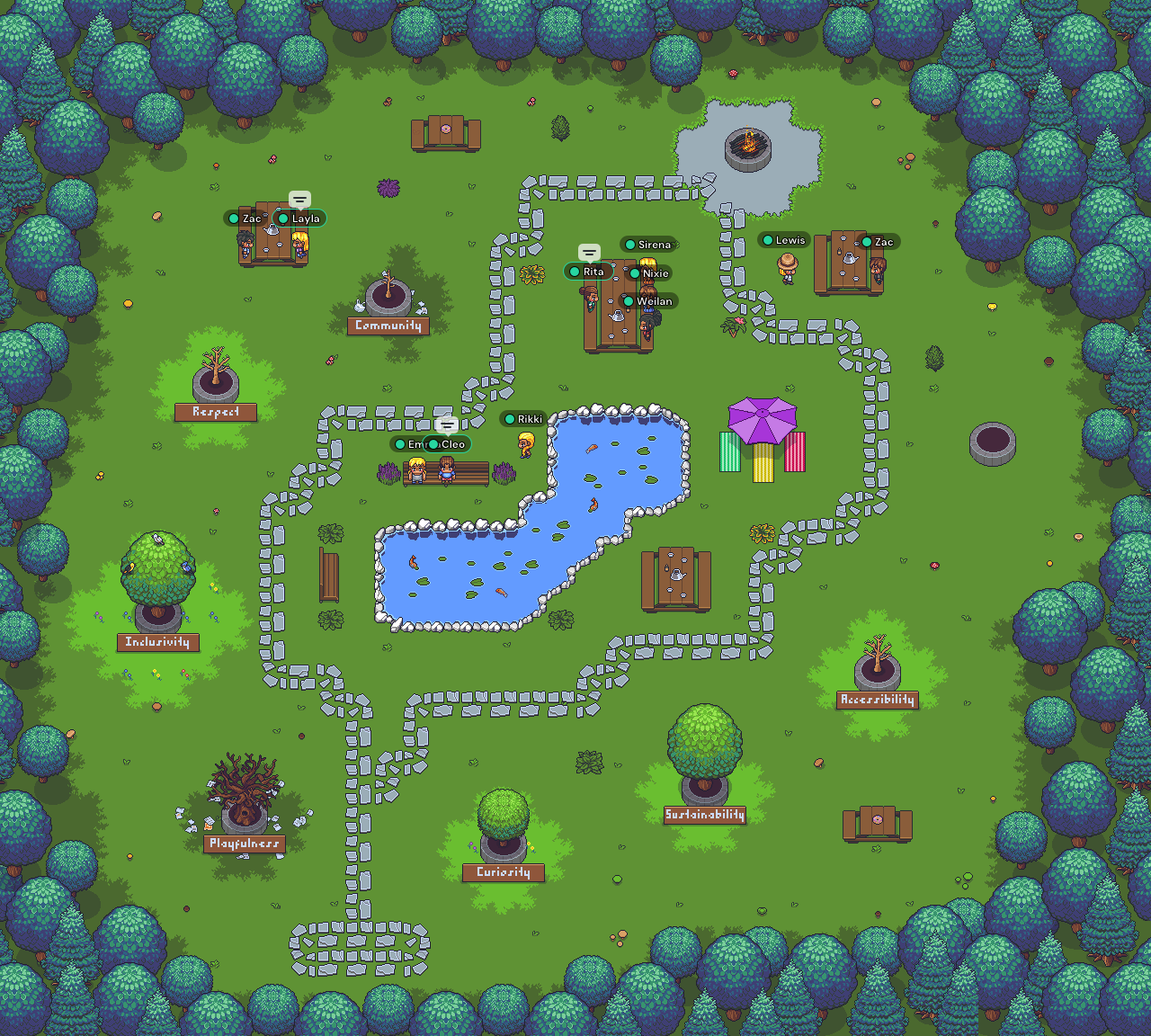 And instead of communicating in links, we can now say “Let’s meet in the tea garden for a quick chat!” – and it just feels different. We all have a mental image of the space and know where we need to go. Yes, ultimately we’re still clicking on a link and joining with our mic and camera (along with any technical difficulties that come with that), but we get to share a table together or sit around a campfire. We’re inhabiting a space together, with our camera feeds just an add-on.