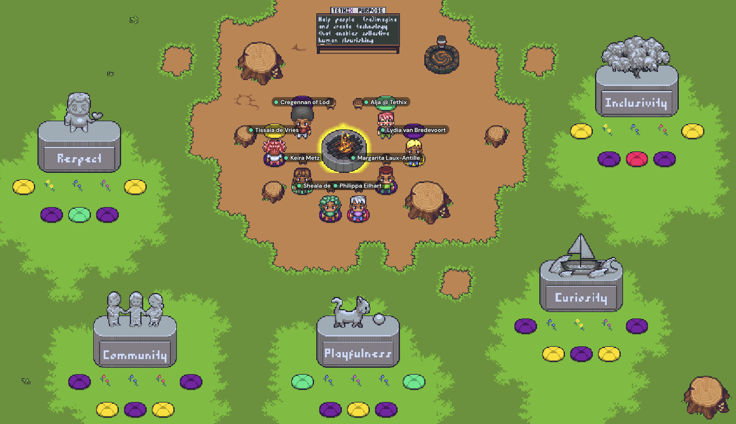 From the Tethix Café, you can visit the Ethical Clearing, another demo space we built as part of the Zorya Ethics Camp offering. In the Ethical Clearing, your team can sit around a campfire as you gradually explore how you relate to your values and learn to write actionable pledges.