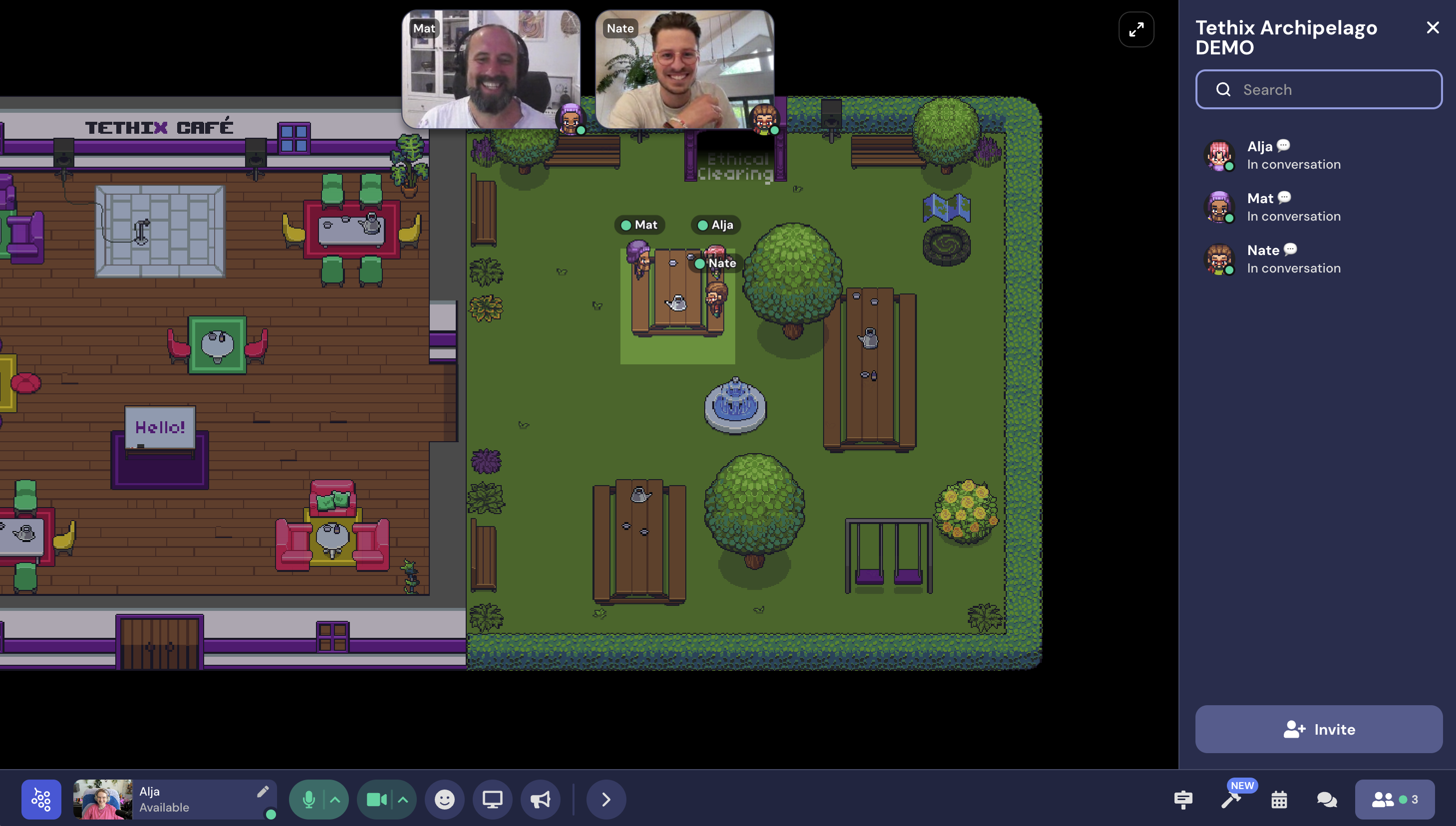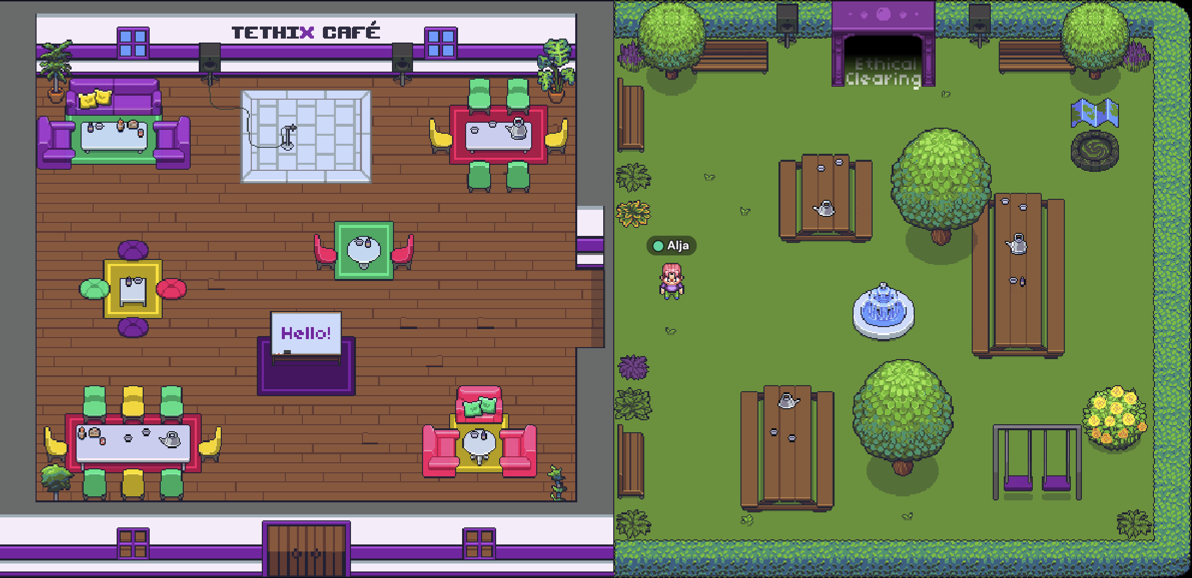 Simplicity makes Gather more accessible and sustainable than a fully immersive virtual world that requires specialized equipment or state-of-the-art computer graphics. You can even access Gather through a mobile web browser, and the combined size of the PNG files that are used for the Tethix Café map is just 79 KB.