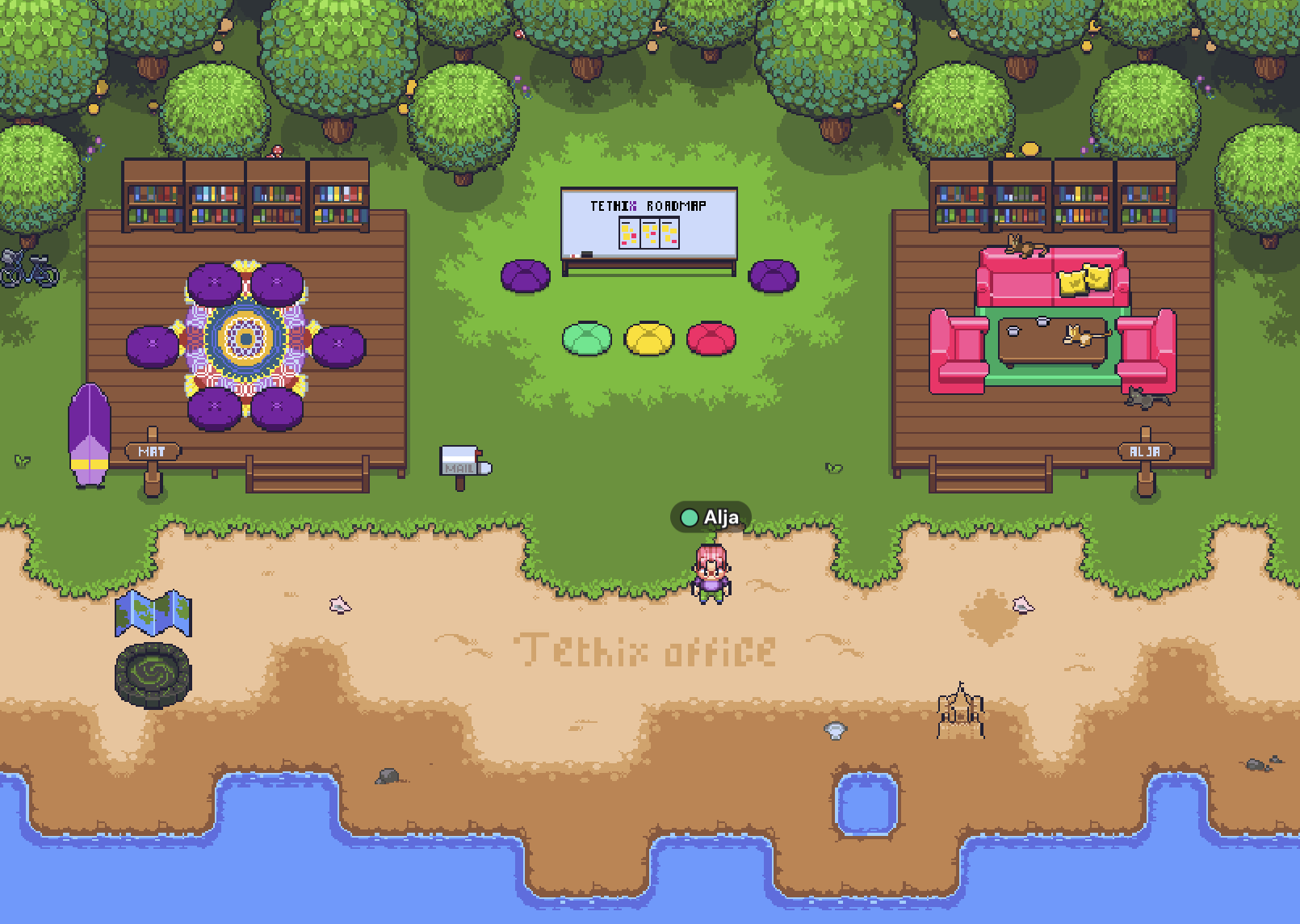 Instead of building a boring office with cubicles – it never rains in Gather, so there’s no need for walls and roofs over our heads! – we envisioned the Tethix Office as a cozy experience at the beach. Our individual offices match our personalities and interests – Nate’s office is still under construction, but will be added soon – and we also have a shared space to talk about our roadmap.