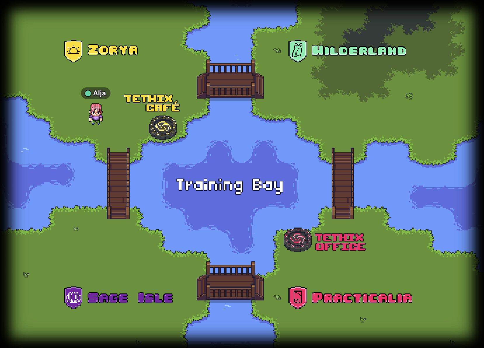 The Archipelago we’ve built in Gather consists of several rooms, connected by portals. When you first enter the Archipelago, you land on a simple world map with the four islands. The islands are now connected by bridges, so you don’t need a boat to get around. As you walk around, you can learn more about each island by getting close to its symbol and pressing X on your keyboard to open a note with a bit of lore.