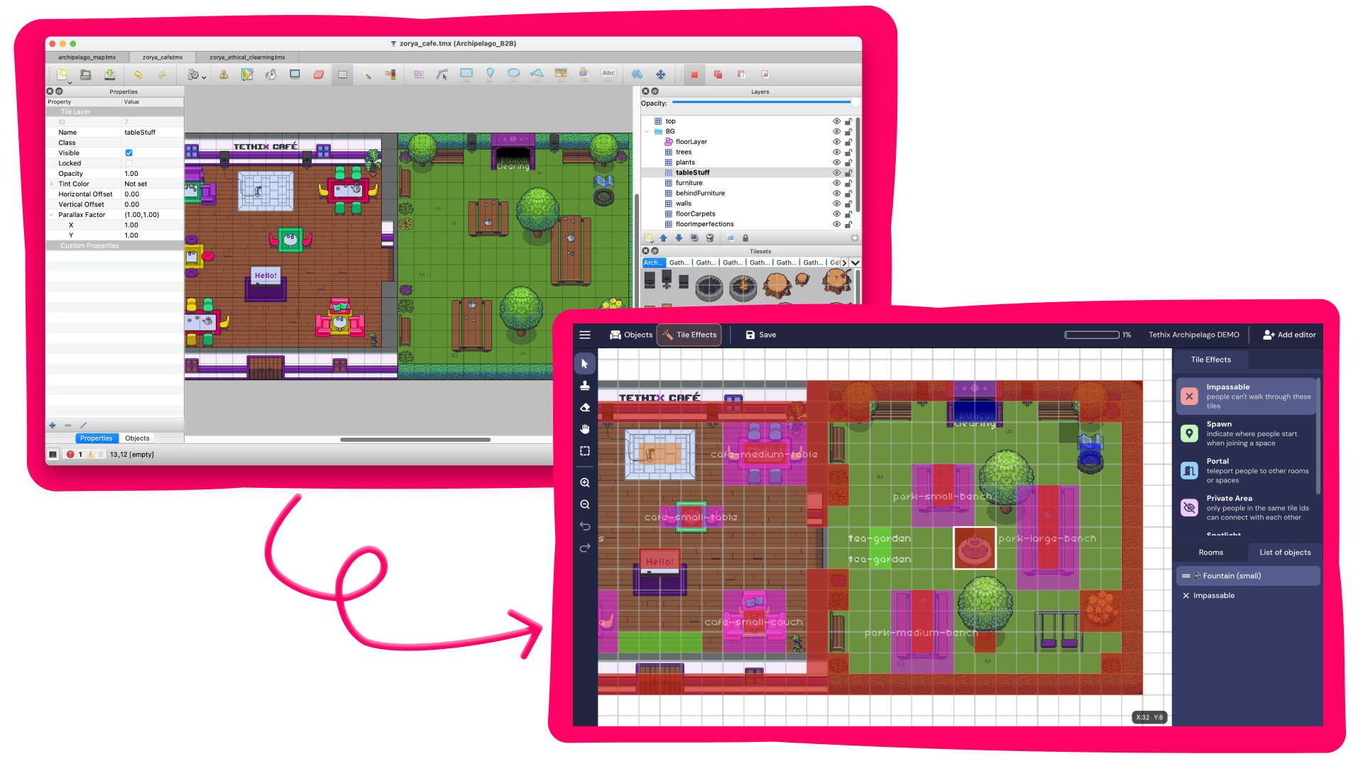 Behind the scenes: building the Archipelago maps in Tiled, using Gather Mapmaker to add tile effects and interactive objects in rooms